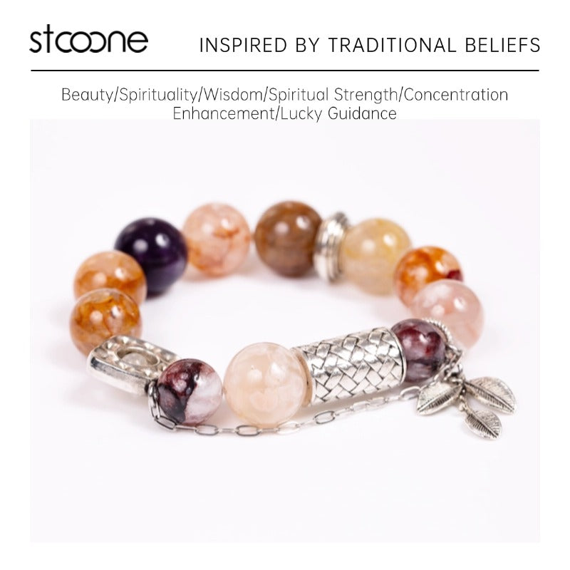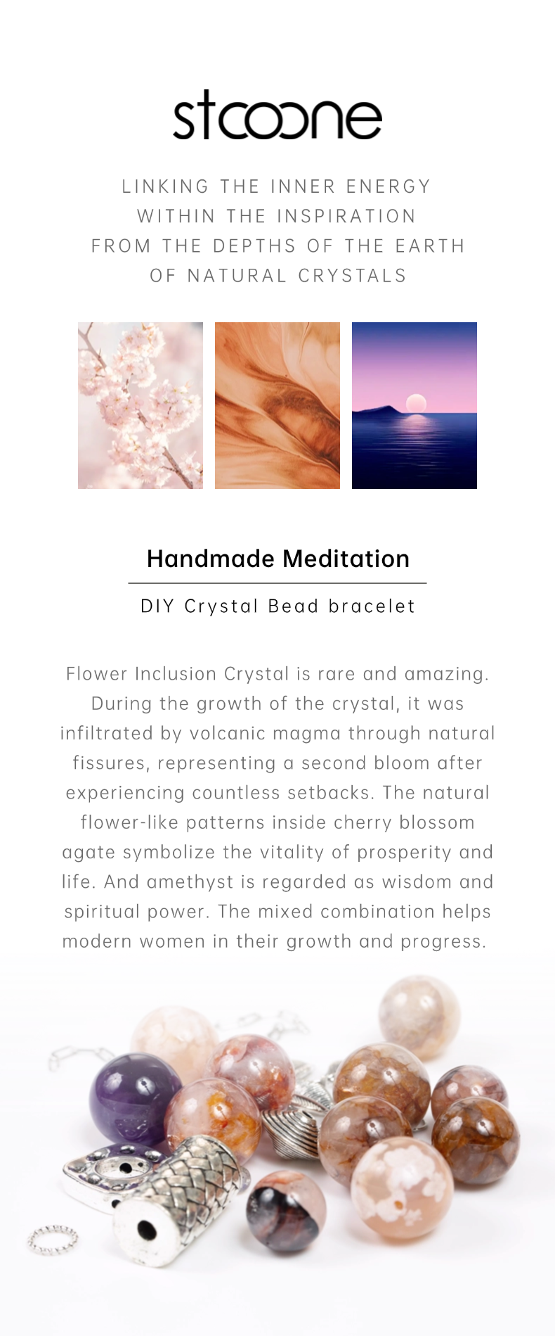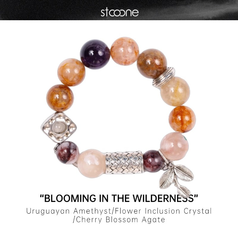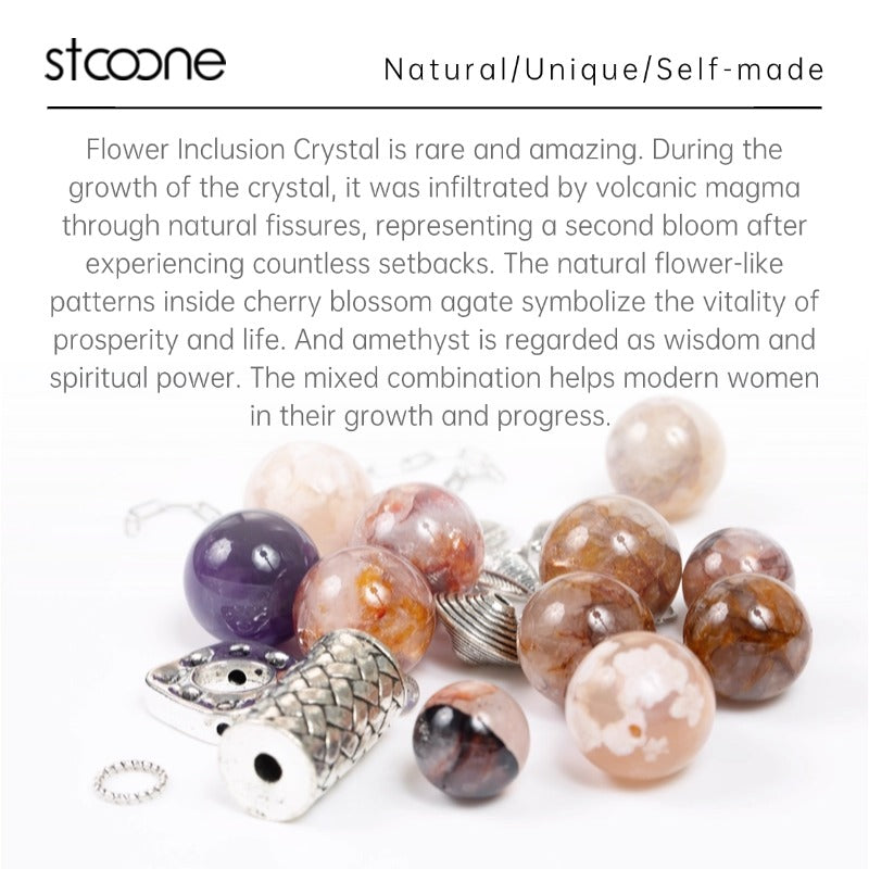 During the growth of the crystal, it was infiltrated by volcanic magma through natural fissures, representing a second bloom after experiencing countless setbacks. The natural flower-like patterns inside cherry blossom agate symbolize the vitality of prosperity and life. And amethyst is regarded as wisdom and spiritual power. The mixed combination helps modern women in their growth and progress.